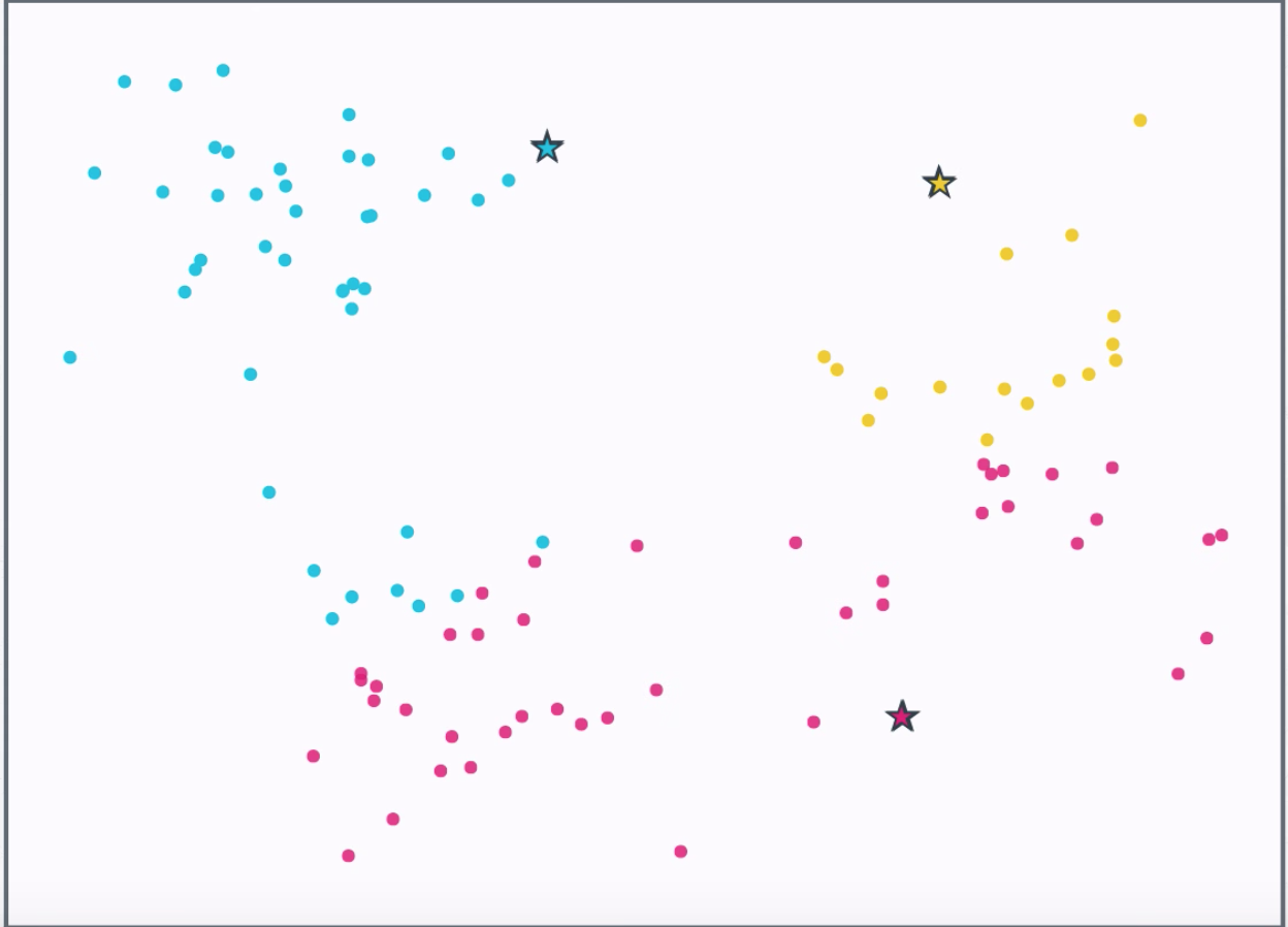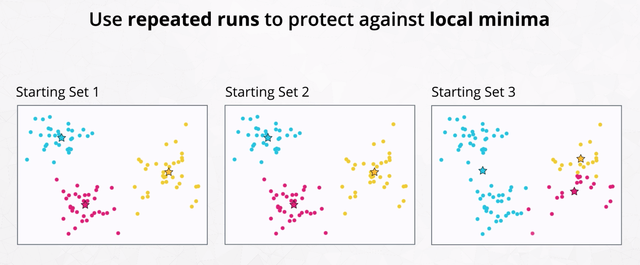 - Take a new centroid c(i), choosing an instance x(i) with probability based on distance to already chosen centroids. This probability distribution ensures that instances farther away from already chosen centroids are much more likely be selected as centroids.