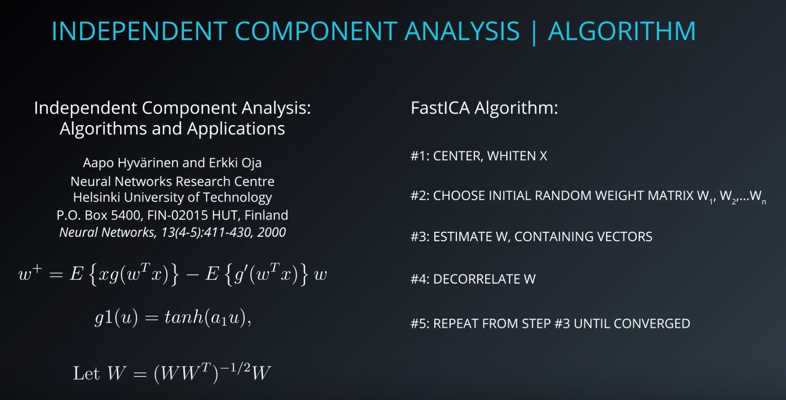 "Independent component analysis: algorithms and applications"(http://citeseerx.ist.psu.edu/viewdoc/download?doi=10.1.1.322.679&rep=rep1&type=pdf)